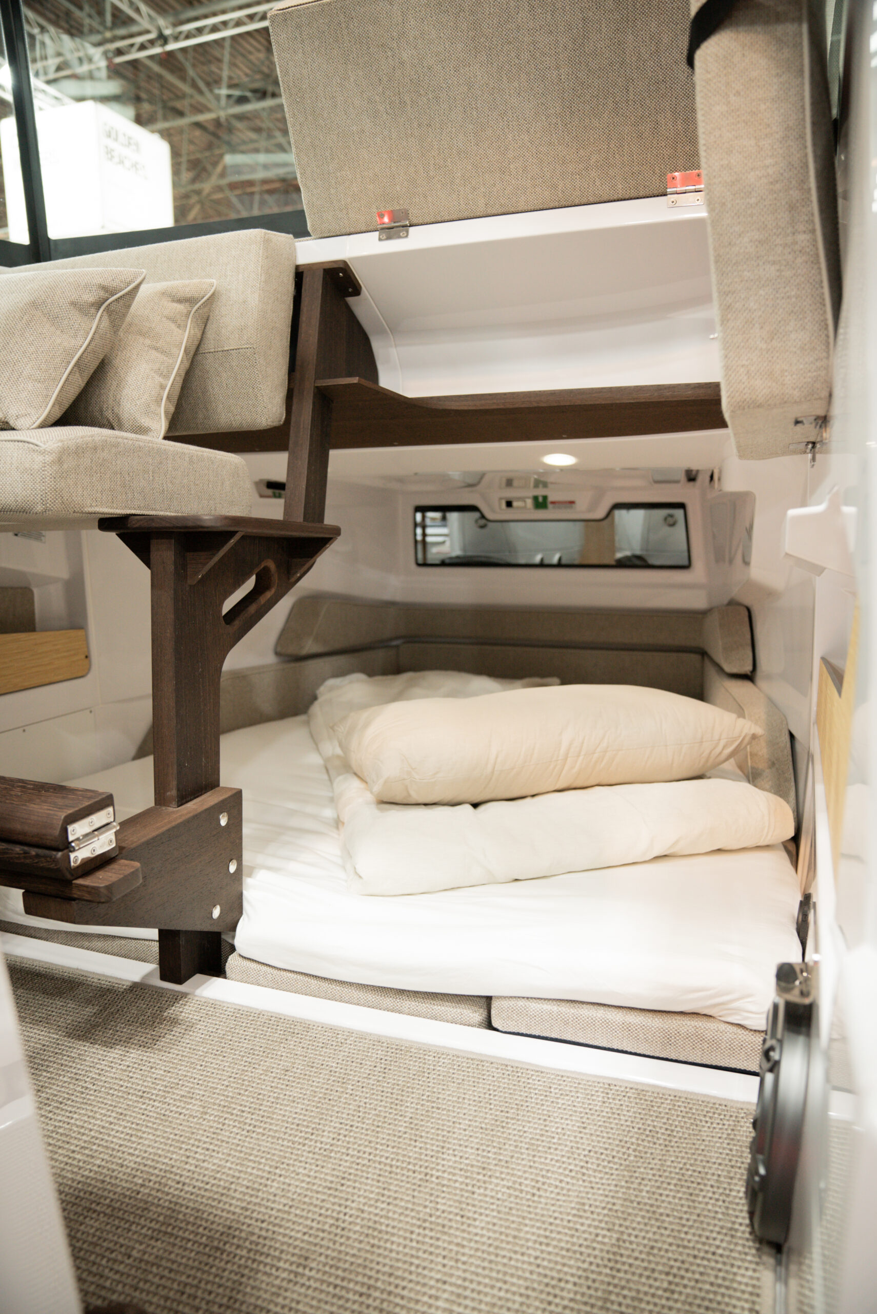 Daudzfunkcionālā kabīne (Multi-Cabin): Priekšgalā zem klāja ir pieejama guļamvieta divām personām, kurā var integrēt arī tualeti un izlietni.
