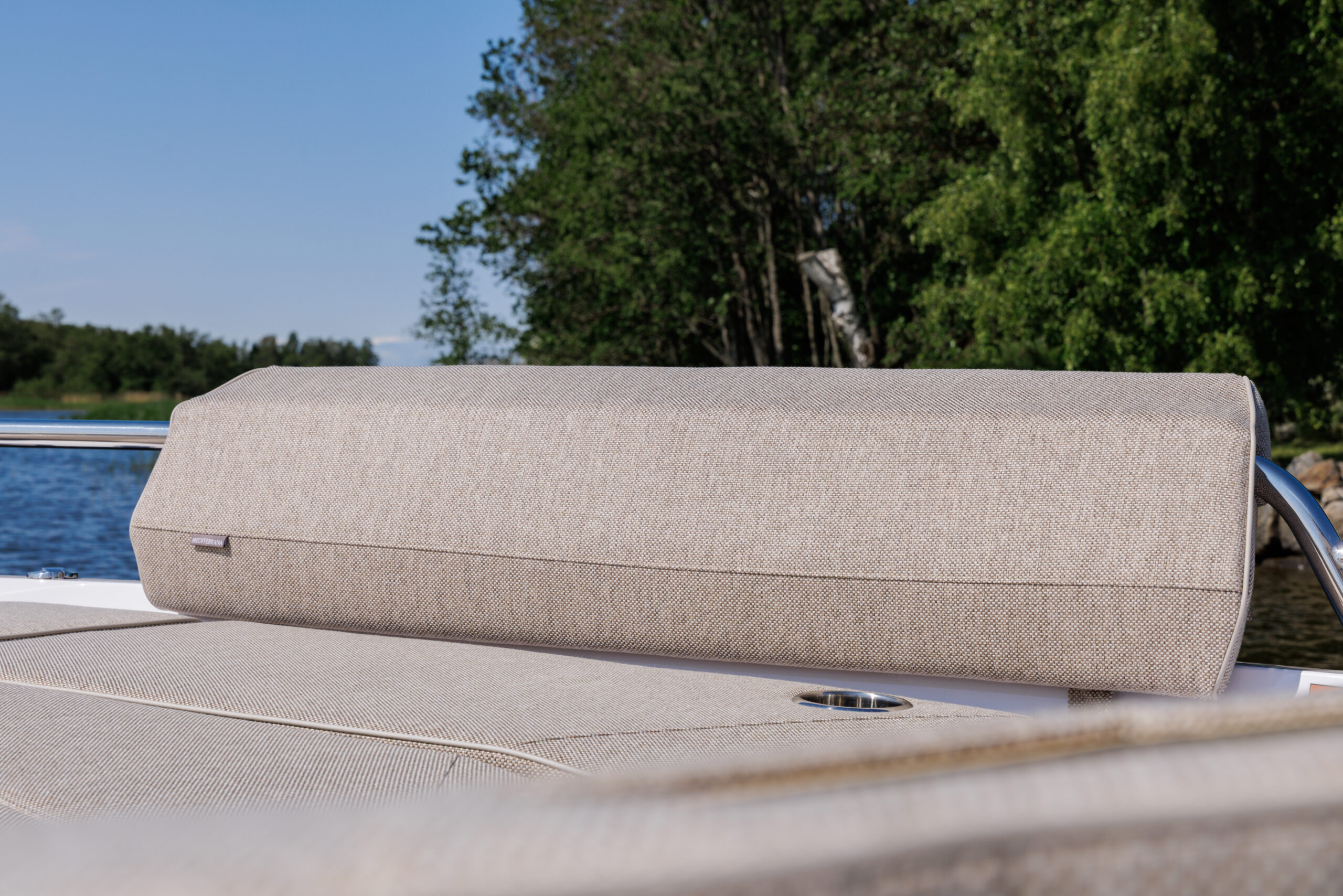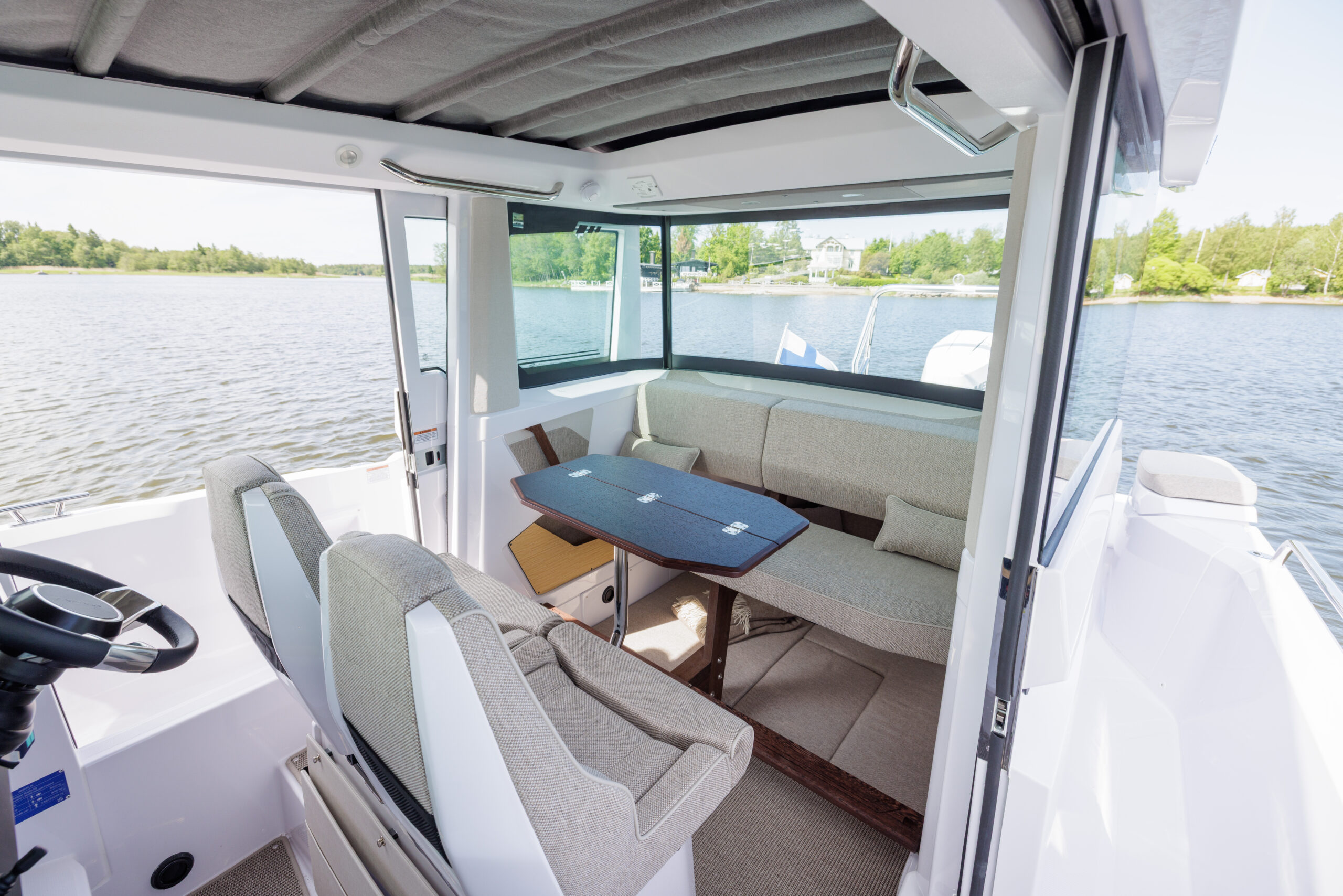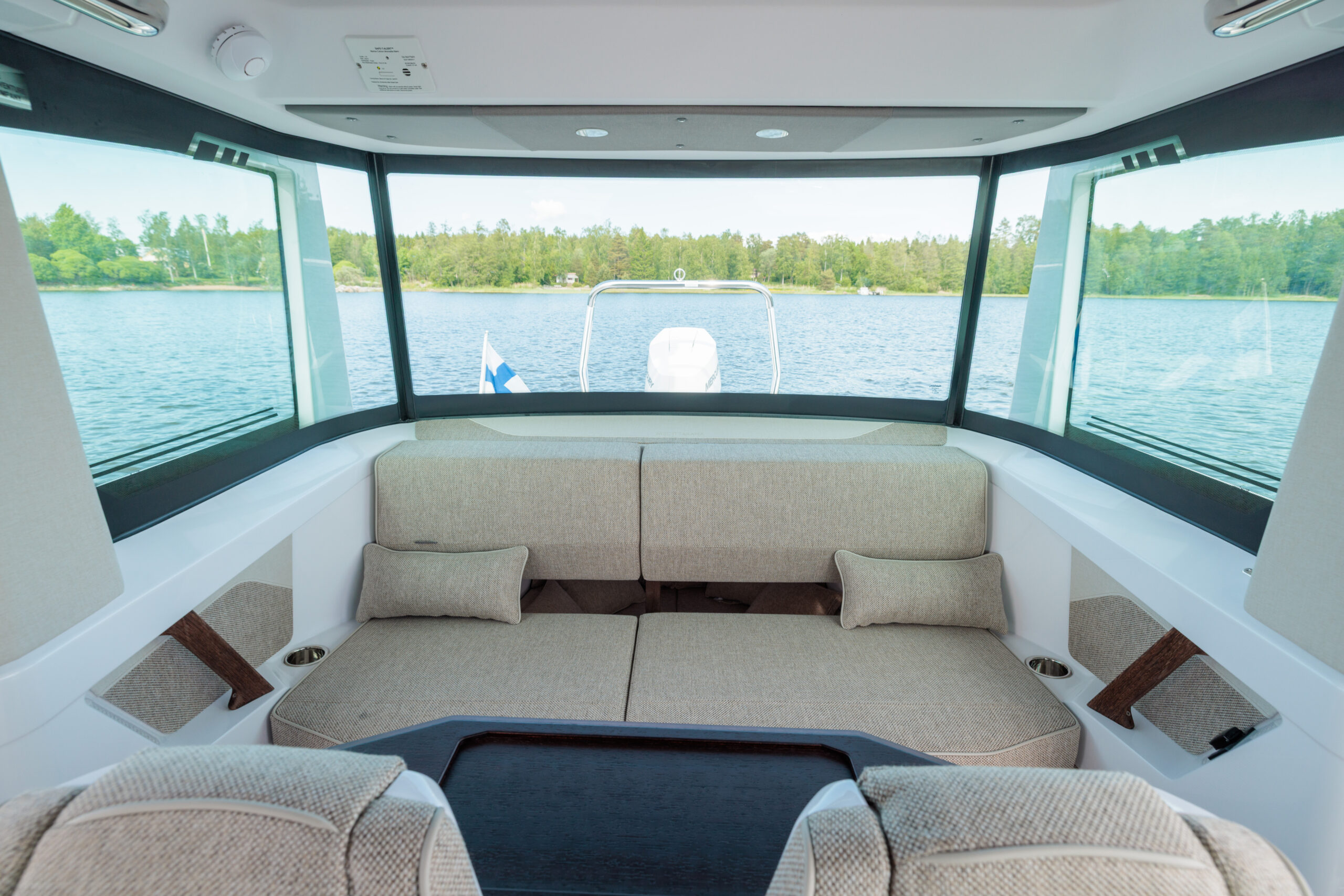 – Clarion audio sistēma- Mediterana edition w. Aft. cabin – U-0sofa ar galdiņu priekšā